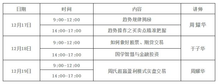 本课程以简易浓缩、落地操作性强为特色,将《大学》《老子》 《庄子》 《孙子兵法》《周易》《王阳明心学》等中国传统智慧与股市期市投资交易融会贯通,并将中国智慧之核心精髓的内容融入到一套简单易学的交易体系当中,旨在通过高效浓缩的特训,为有缘的学员和企业构建一套能够在市场中赖以生存、并能够持续稳定盈利的股市期市交易体系。